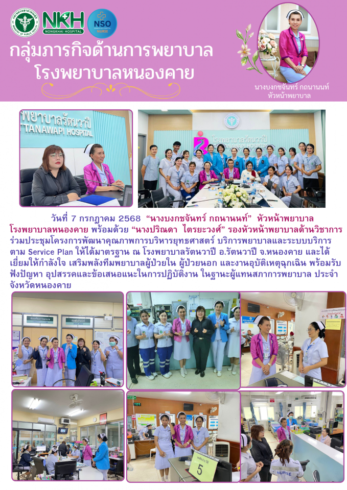 วันที่ 7 กรกฎาคม 2568“นางบงกชจันทร์ กถนานนท์” หัวหน้าพยาบาล โรงพยาบาลหนองคาย พร้อมด้วย“นางปริณดา ไตรยะวงศ์” รองหัวหน้าพยาบาลด้านวิชาการ ร่วมประชุมโครงการพัฒนาคุณภาพการบริหารยุทธศาสตร์ บริการพยาบาลและระบบบริการตาม Service Plan ให้ได้มาตรฐาน ณ โรงพยาบาลรัตนวาปี อ.รัตนวาปี จ.หนองคาย และได้เยี่ยมให้กำลังใจ เสริมพลังทีมพยาบาลผู้ป่วยใน ผู้ป่วยนอก และงานอุบัติเหตุฉุกเฉิน พร้อมรับฟังปัญหา อุปสรรคและข้อเสนอแนะในการปฏิบัติงาน ในฐานะผู้แทนสภาการพยาบาล ประจำจังหวัดหนองคาย