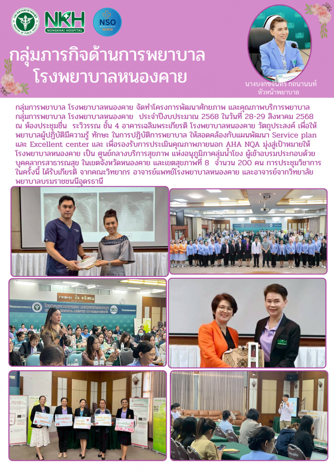 กลุ่มการพยาบาล โรงพยาบาลหนองคาย จัดทำโครงการพัฒนาศักยภาพ และคุณภาพบริการพยาบาล กลุ่มการพยาบาล โรงพยาบาลหนองคาย ประจำปีงบประมาณ 2568 ในวันที่ 28-29 สิงหาคม 2568 ณ ห้องประชุมชื่น ระวิวรรณ ชั้น 4 อาคารเฉลิมพระเกียรติ โรงพยาบาลหนองคาย วัตถุประสงค์ เพื่อให้พยาบาลผู้ปฏิบัติมีความรู้ ทักษะ ในการปฏิบัติการพยาบาล ให้สอดคล้องกับแผนพัฒนา Service plan และ Excellent center และ เพื่อรองรับการประเมินคุณภาพภายนอก AHA NQA มุ่งสู่เป้าหมายให้โรงพยาบาลหนองคาย เป็น ศูนย์กลางบริการสุขภาพ แห่งอนุภูมิภาคลุ่มน้ำโขง ผู้เช้าอบรมประกอบด้วยบุคคลากรสาธารณสุข ในเขตจังหวัดหนองคาย และเขตสุขภาพที่ 8 จำนวน 200 คน การประชุมวิชาการ ในครั้งนี้ ได้รับเกียรติ จากคณะวิทยากร อาจารย์แพทย์โรงพยาบาลหนองคาย และอาจารย์จากวิทยาลัยพยาบาลบรมราชชนนีอุดรธานี