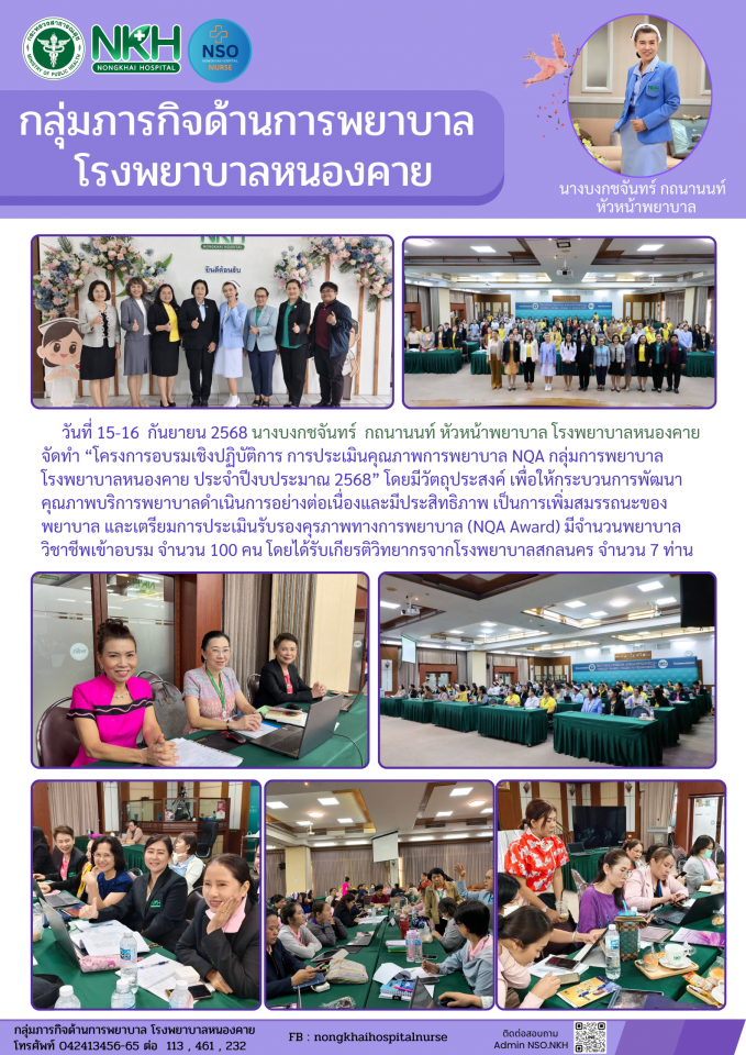 จัดทำ “โครงการอบรมเชิงปฏิบัติการ การประเมินคุณภาพการพยาบาล NQA กลุ่มการพยาบาล โรงพยาบาลหนองคาย ประจำปีงบประมาณ 2568” โดยมีวัตถุประสงค์ เพื่อให้กระบวนการพัฒนาคุณภาพบริการพยาบาลดำเนินการอย่างต่อเนื่องและมีประสิทธิภาพ เป็นการเพิ่มสมรรถนะของพยาบาล และเตรียมการประเมินรับรองคุรภาพทางการพยาบาล (NQA Award) มีจำนวนพยาบาลวิชาชีพเข้าอบรม จำนวน 100 คน โดยได้รับเกียรติวิทยากรจากโรงพยาบาลสกลนคร จำนวน 7 คน