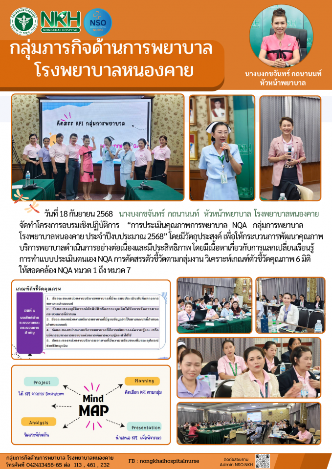 จัดทำโครงการอบรมเชิงปฏิบัติการ “การประเมินคุณภาพการพยาบาล NQA กลุ่มการพยาบาล โรงพยาบาลหนองคาย ประจำปีงบประมาณ 2568” โดยมีวัตถุประสงค์ เพื่อให้กระบวนการพัฒนาคุณภาพบริการพยาบาลดำเนินการอย่างต่อเนื่องและมีประสิทธิภาพ โดยมีเนื้อหาเกี่ยวกับการแลกเปลี่ยนเรียนรู้ การทำแบบประเมินตนเอง NQA การคัดสรรตัวชี้วัดตามกลุ่มงาน วิเคราะห์เกณฑ์ตัวชี้วัดคุณภาพ 6 มิติ ให้สอดคล้อง NQA หมวด 1 ถึง หมวด 7