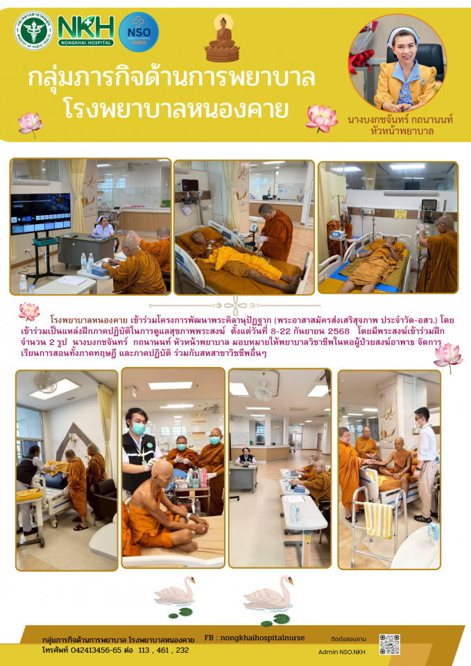 โรงพยาบาลหนองคาย เข้าร่วมโครงการพัฒนาพระคิลานุปัฏฐาก (พระอาสาสมัครส่งเสริสุจภาพ ประจำวัด-อสว.) โดยเข้าร่วมเป็นแหล่งฝึกภาคปฏิบัติในการดูแลสุขภาพพระสงฆ์ ตั้งแต่วันที่ 8-22 กันยายน 2568 โดยมีพระสงฆ์เข้าร่วมฝึก จำนวน 2 รูป นางบงกชจันทร์ กถนานนท์ หัวหน้าพยาบาล มอบหมายให้พยาบาลวิชาชีพในหอผู้ป่วยสงฆ์อาพาธ จัดการเรียนการสอนทั้งภาคทฤษฎี และภาคปฏิบัติ ร่วมกับสหสาขาวิชชีพอื่นๆ