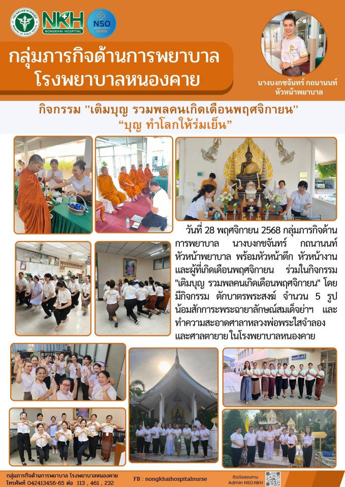 วันที่ 28 พฤศจิกายน 2568 กลุ่มภารกิจด้านการพยาบาล นางบงกชจันทร์ กถนานนท์ หัวหน้าพยาบาลพร้อมหัวหน้าตึก หัวหน้างาน และผู้ที่เกิดเดือนพฤศจิกายน ร่วมในกิจกรรม"เติมบุญ รวมพลคนเกิดเดือนพฤศจิกายน" โดยมีกิจกรรม ตักบาตรพระสงฆ์ จำนวน5 รูป น้อมสักการะพระฉายาลักษณ์สมเด็จย่าฯและทำความสะอาดศาลาหลวงพ่อพระใสจำลอง และศาลตายาย ในโรงพยาบาลหนองคาย